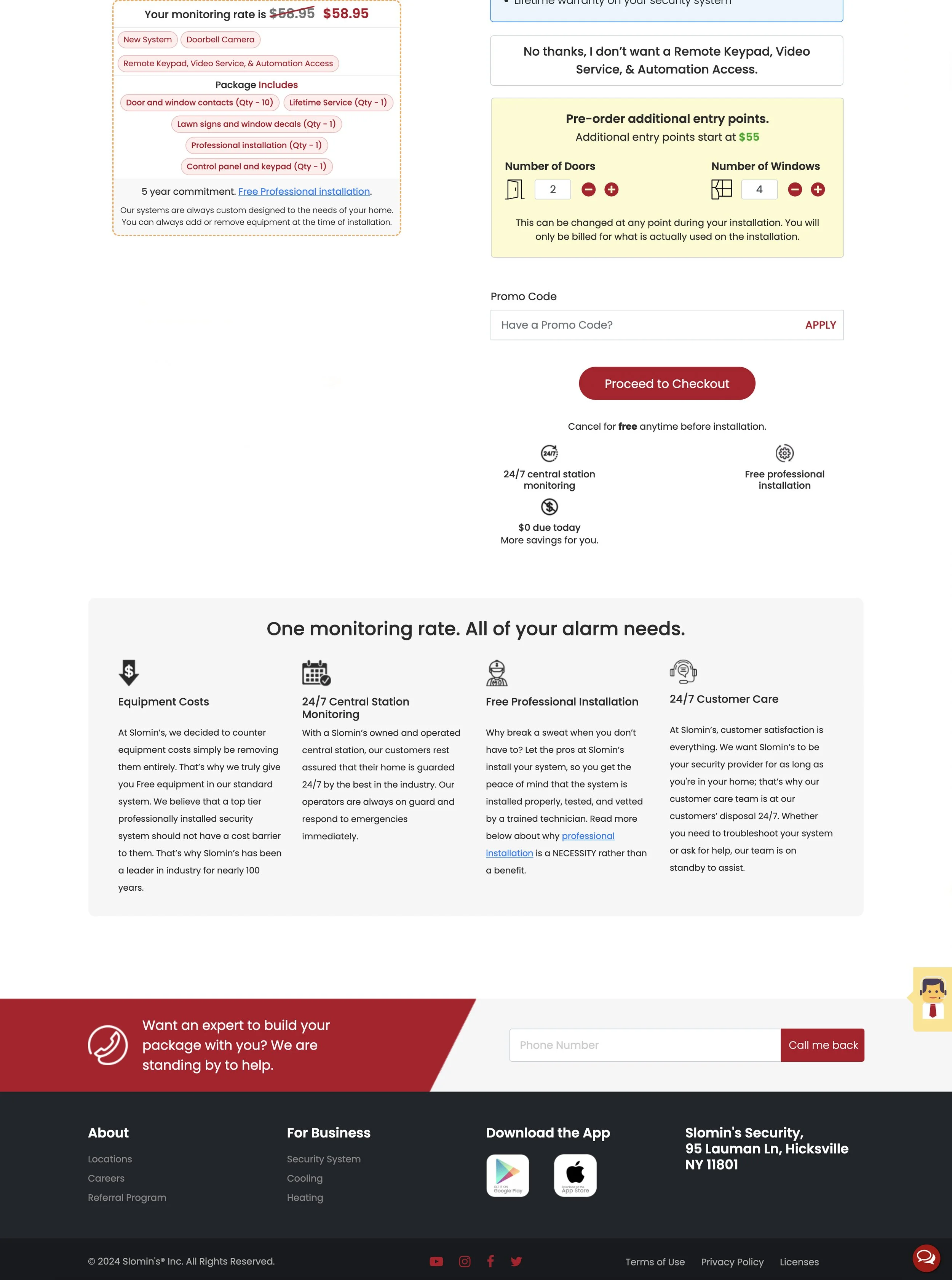 Once a customer has checked to see if our service is available in their area, they proceed to the offers page, where they get the basic system, any add-ons of their choosing, along with any free offers Slomins may have for their customer. As they make a selection, more options open up further down the page. From there, the customer will proceed to the checkout.